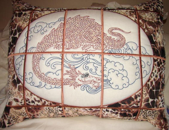 A cushion / pillow made from using two sets Q0179 - Mystical Dragon and Q0178 - Accessory Quilt set For this pillow we just added on the 5x3 sashing panels from CCQ0178, onto the top and onto the bottom.